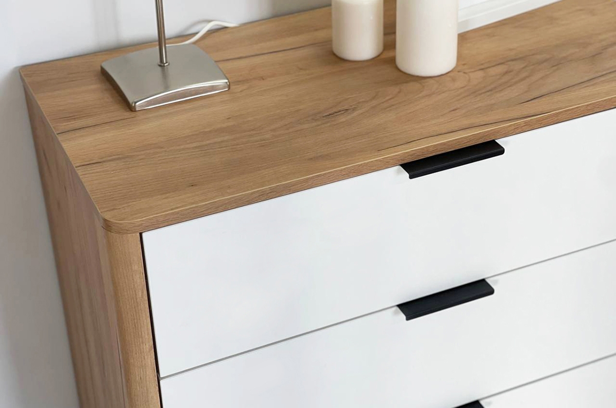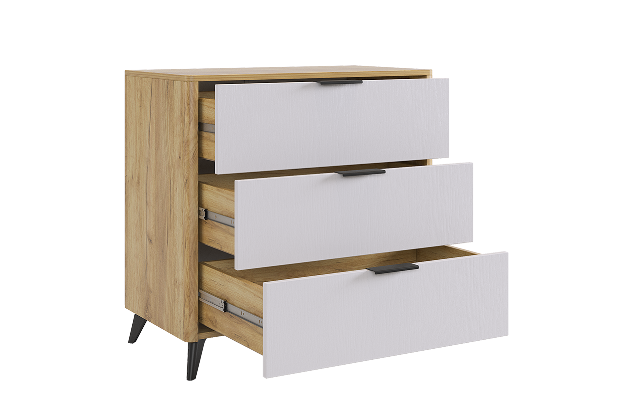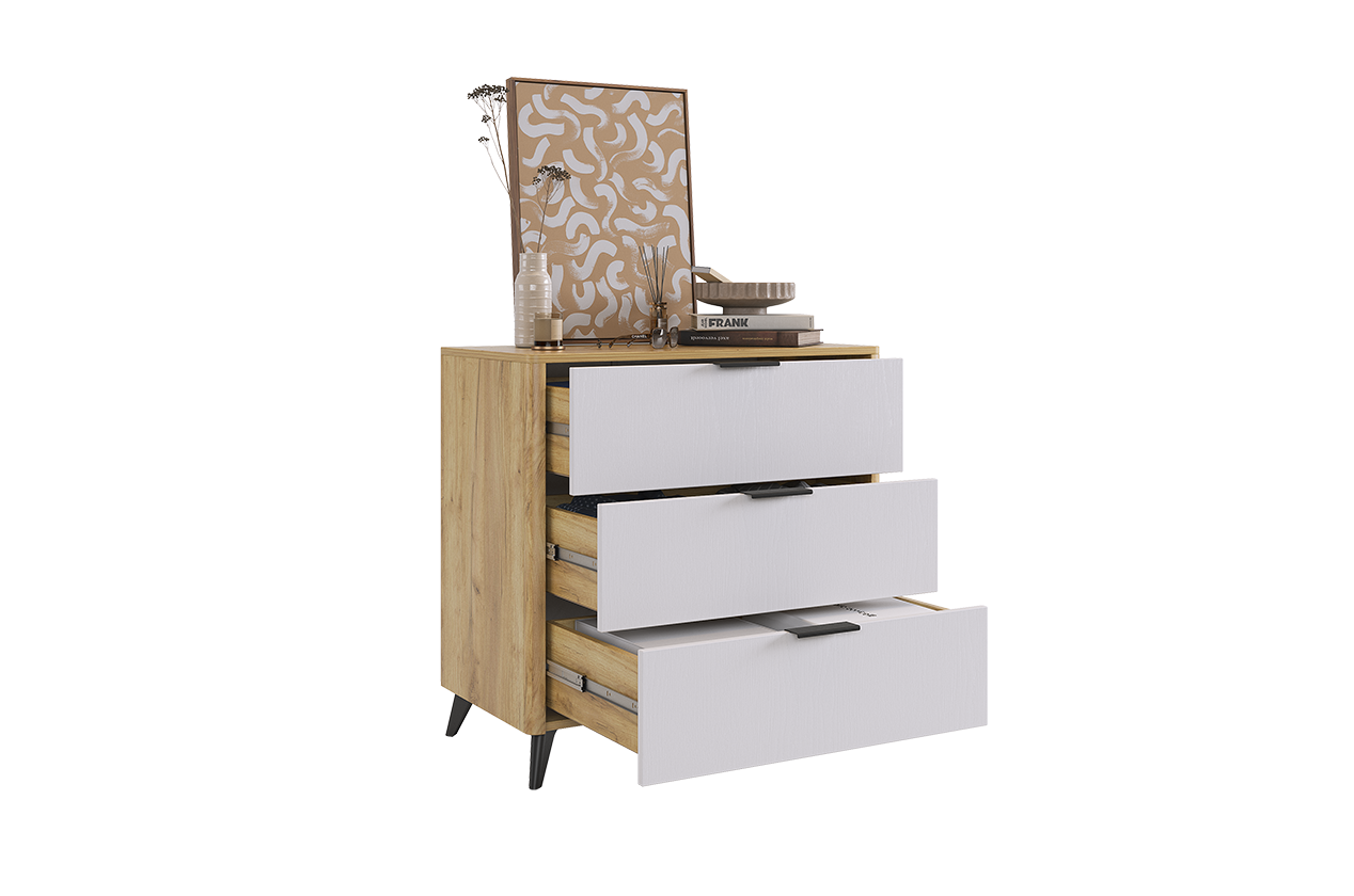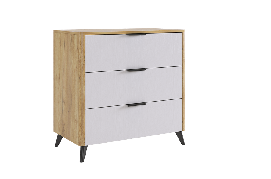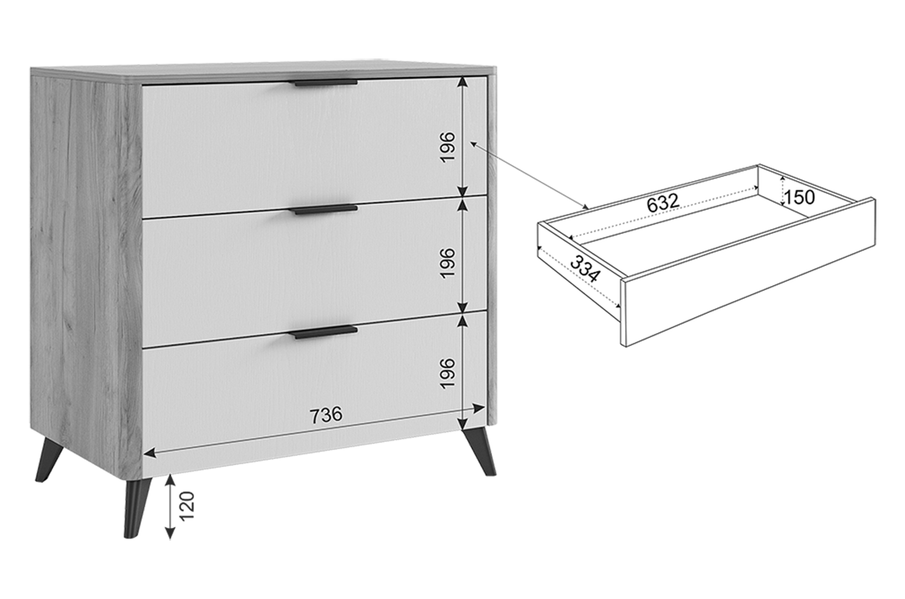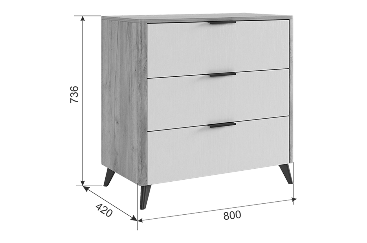Состоит из: 3-х ящиков. Стильное решение для современного интерьера, комод "Адам". В трех выдвижных ящиках на шариковых направляющих поместятся все личные вещи. Под высокими, лаконичными опорами, легко уберется робот- пылесос и в вашей спальне всегда будет чисто и свежо. Благодаря полукруглым профилям на боковинах комода, вы легко и безболезненно обойдете углы, даже если поставите комод в самое узкое пространство. Комод можно использовать как трюмо, если повесить зеркало сверху. Зеркало приобретается отдельно. Комод отлично сочетается со всеми модулями спальни "Адам".