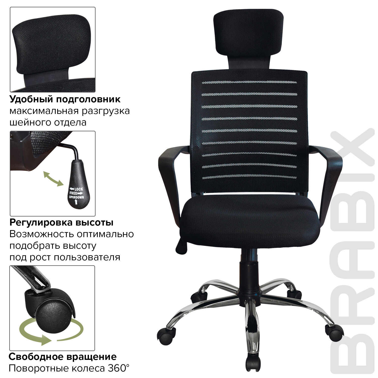 Материал обивки: ткань/сетка. Цвет обивки: черный. Максимальная нагрузка: до 120 кг. Механизм качания: да. Тип механизма: "топ-ган" качание с регулировкой под вес и фиксацией в 1 положении. Сетка в спинке : да. Крестовина (пятилучие): хромированный металл. Подлокотники: пластик. Минимальная высота кресла: 1120 мм. Максимальная высота кресла: 1220 мм. Ширина кресла: 590 мм. Минимальная высота до сиденья: 430 мм. Максимальная высота до сиденья: 530 мм. Сиденье ширина: 490 мм. Сиденье глубина: 470 мм. Спинка ширина: 440 мм. Спинка высота: 480 мм. Поставляется в разобранном виде: да. Соответствует требованиям ГОСТа: нет Бренд - BRABIX. Производитель - Китай. Артикул - 531924. Штрихкод - 4606224242736