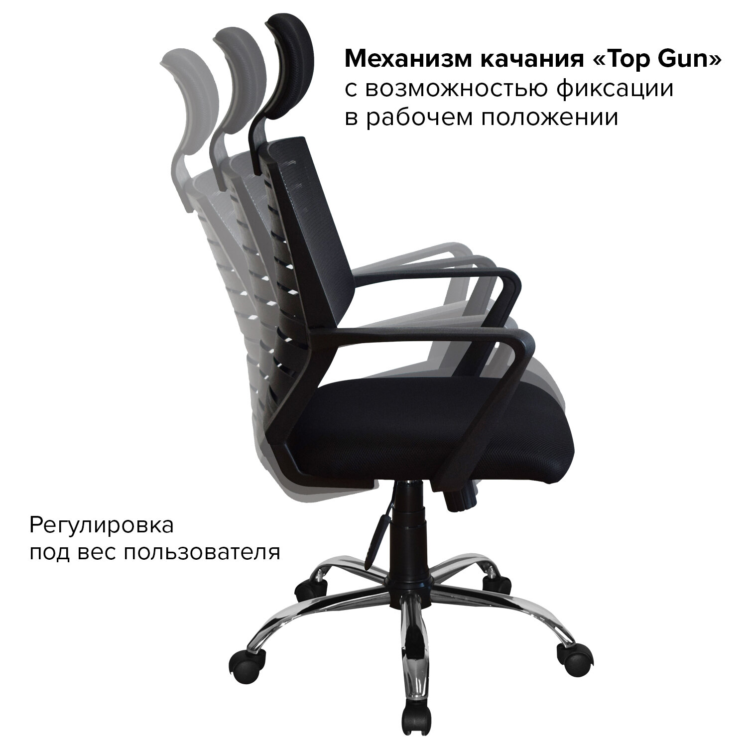 Обивка сиденья - прочная, «дышащая» ткань TW. Этот материал обладает хорошей износостойкостью и способностью впитывать влагу в соответствии с показателями окружающей среды. Благодаря этому материалу, можно чувствовать себя комфортно на рабочем месте в любом температурном режиме.Высокая сетчатая спинка и подголовник, выраженная поддержка поясницы, прочные пластиковые подлокотники, хромированное пятилучие гарантируют комфортное долгосрочное использование.Надежный механизм качания Top-Gun позволяет осуществлять свободное качание с фиксацией в рабочем положении и регулировки наклона под вес сидящего. Он помогает обеспечить хорошую поддержку спины и поясницы.Кресло способно выдерживать нагрузку до 120 кг.