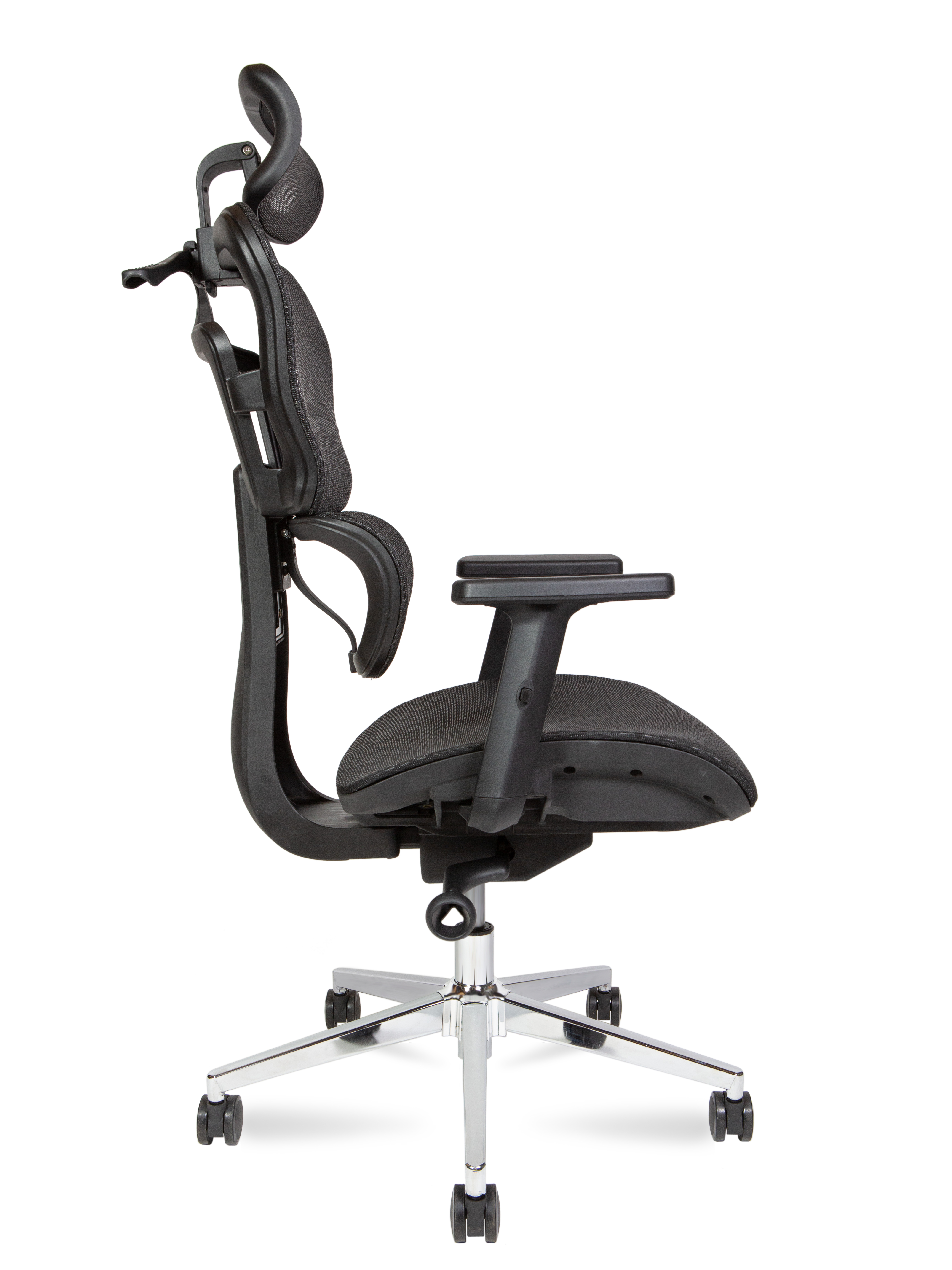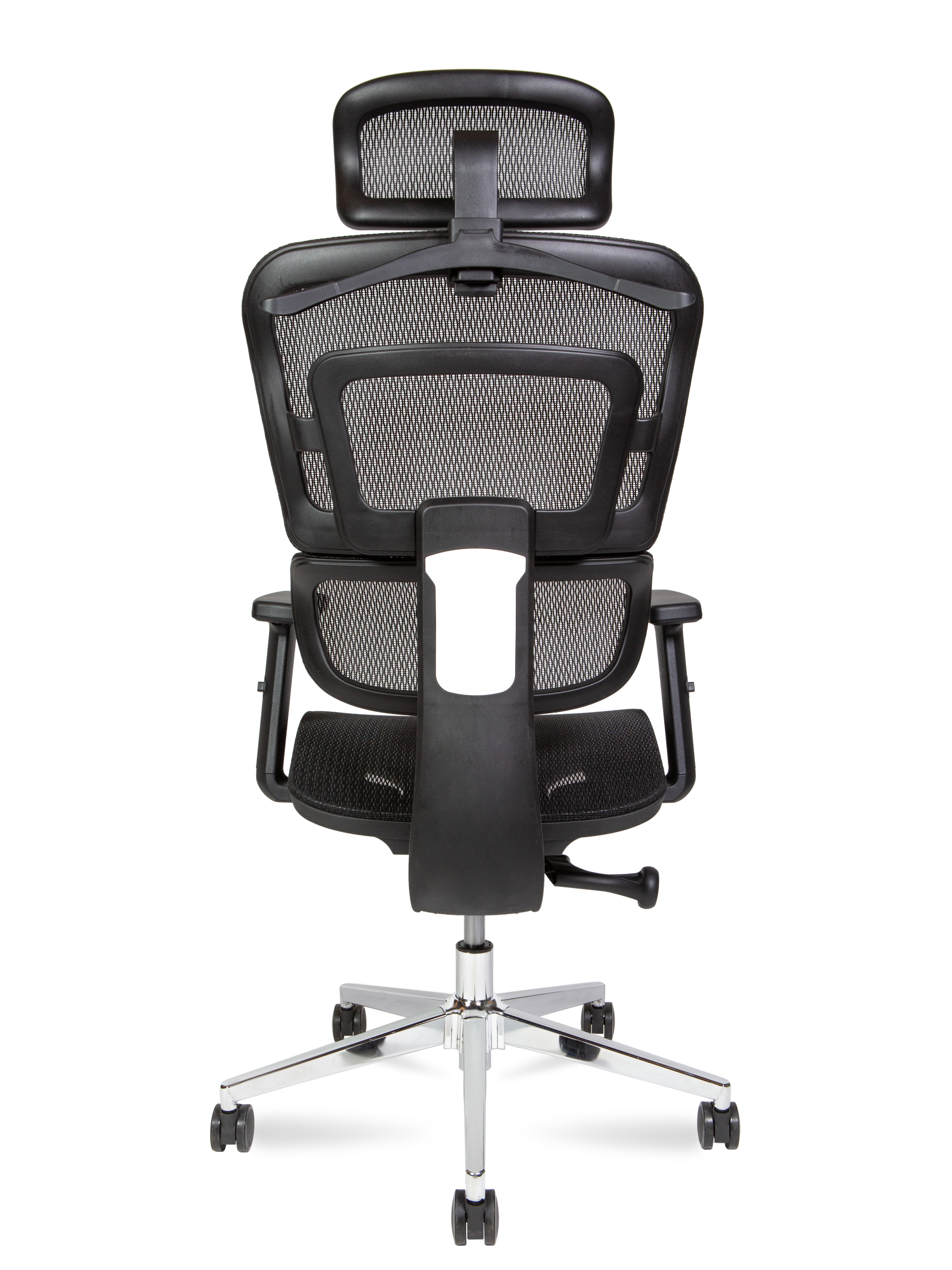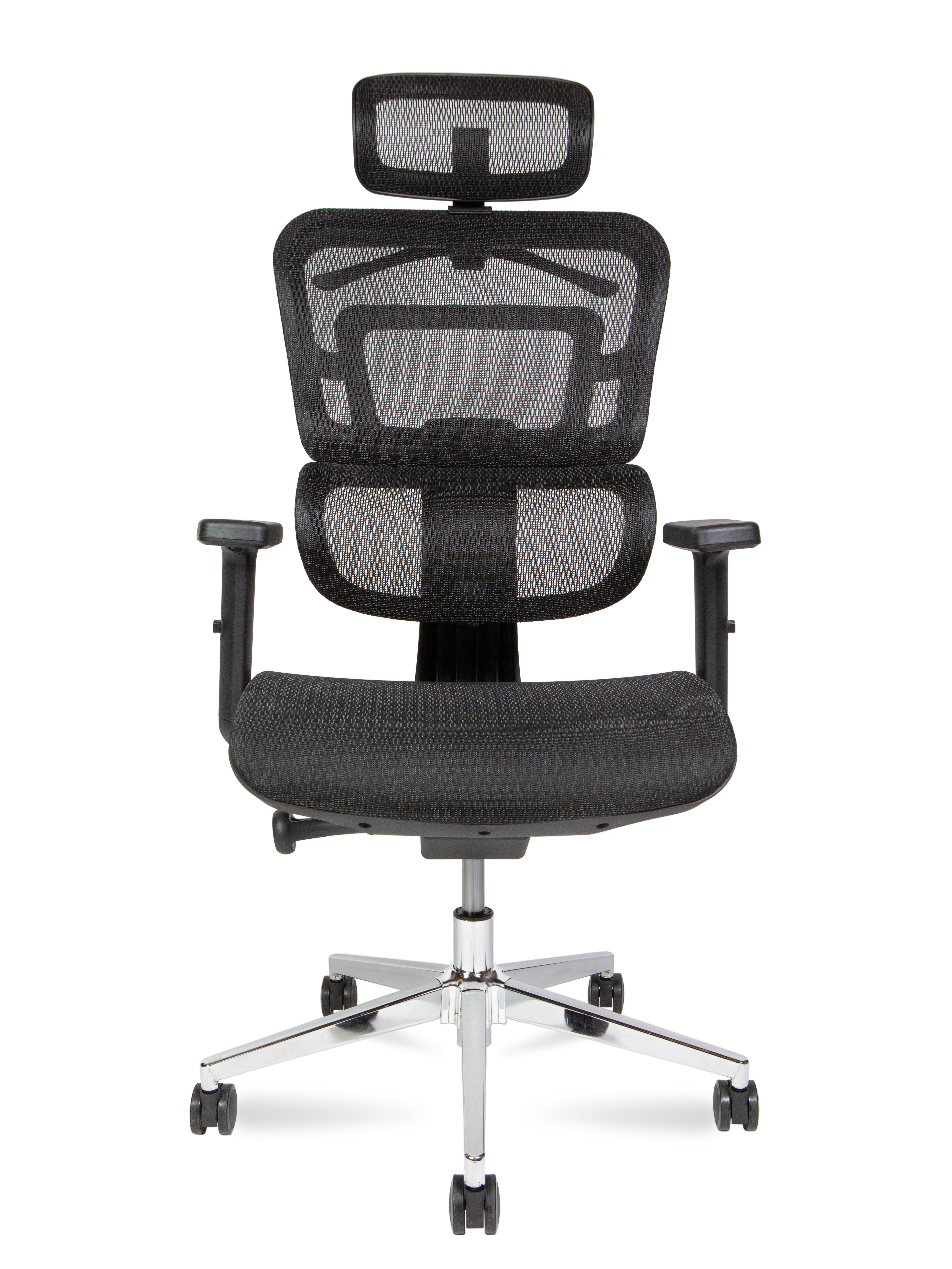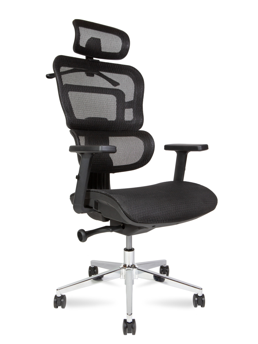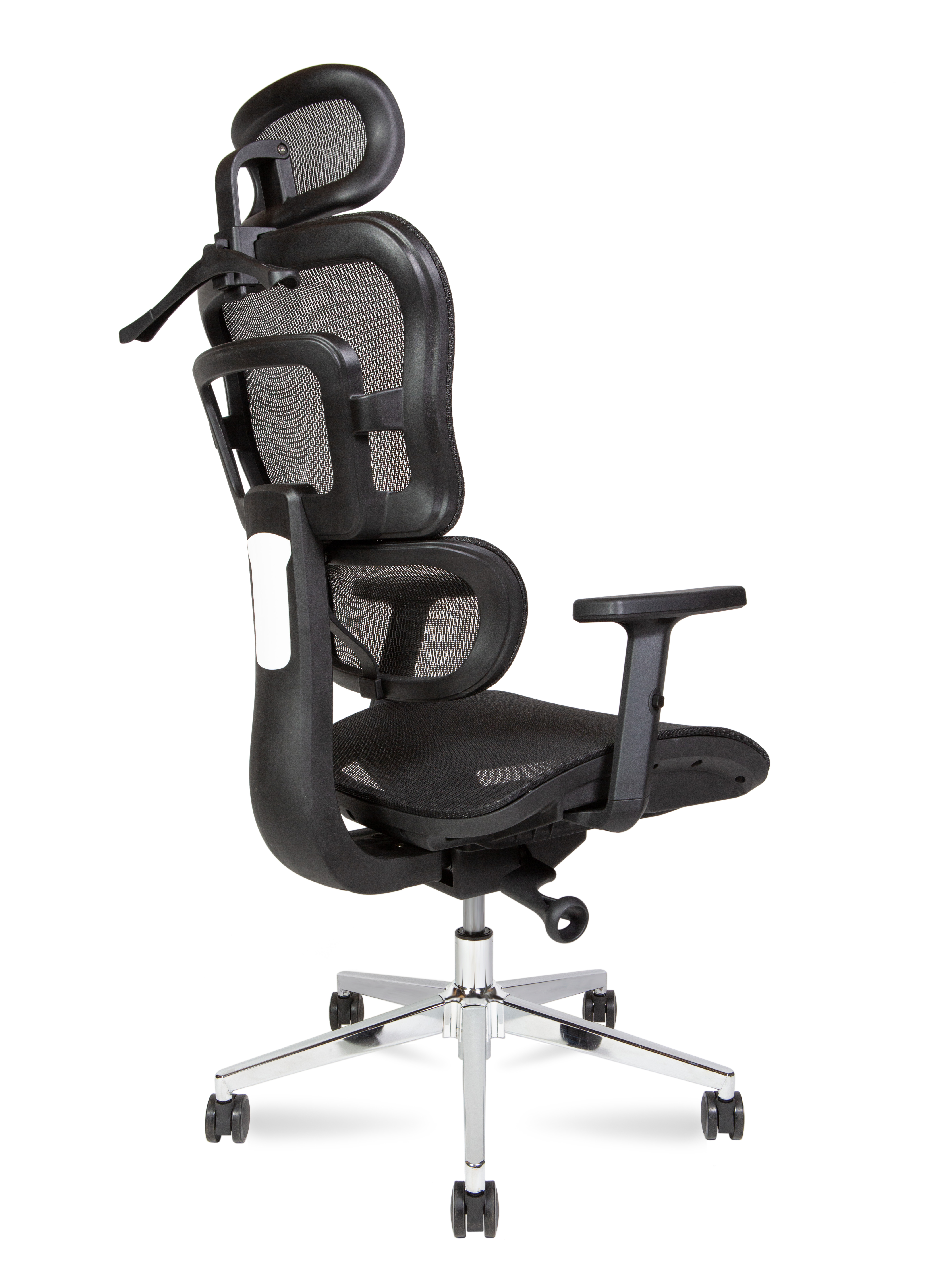 Офисное кресло с регулируемой по высоте спинкой. Регулируемый подголовник. Сиденье с импортной сеткой высокой плотности. 2 D подлокотник ПУ Механизм асинхронный с фиксации в трех положений прочная R:350mm хромовая база Ролики PU BIFMA стандарт Максимальная нагрузка 130 кг.