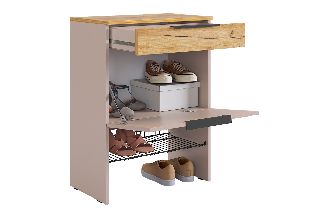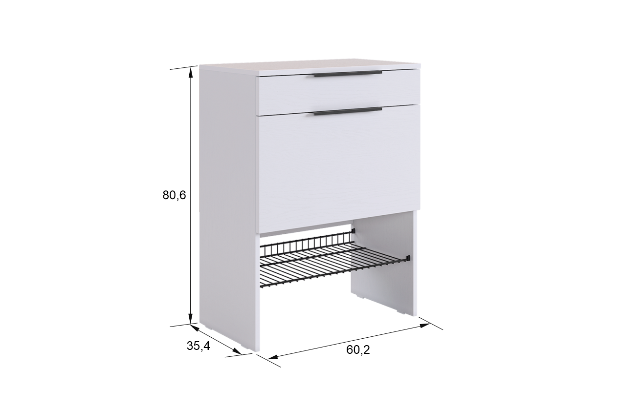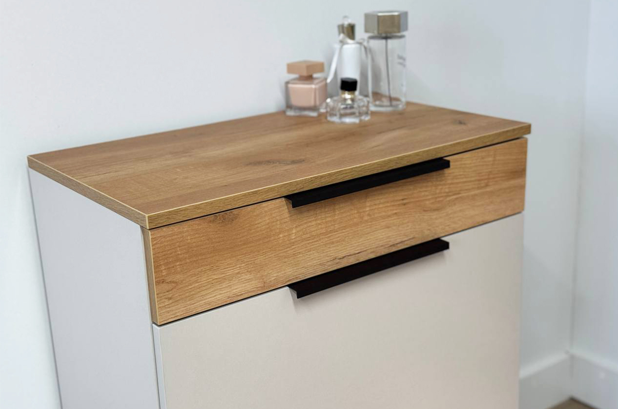 Изготовленная из прочного ЛДСП толщиной 16 мм, обувница обеспечивает надежность и долговечность. Выкатной ящик на шариковых направляющих позволяет легко и плавно открывать и закрывать его, предоставляя дополнительное место для хранения мелочей.