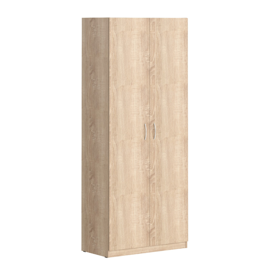 Универсальный двустворчатый шкаф для одежды и белья KANN подойдет для использования в гостинице или дома. Размеры - 870х2100х450 мм, цвет – Дуб Сонома Светлый. Оснащен большим количеством полочек для постоянного или временного хранения одежды, которые закрыты 2 дверцами из ЛДСП под цвет шкафа. На дверцах установлены стильные металлические ручки. Конструкция оснащена прочными силовыми креплениями – эксцентриковыми стяжками. Все торцы основных элементов надежно защищены кромкой ПВХ – 2 мм. Регулируемые по высоте опоры обеспечат шкафу устойчивость на неровном полу.