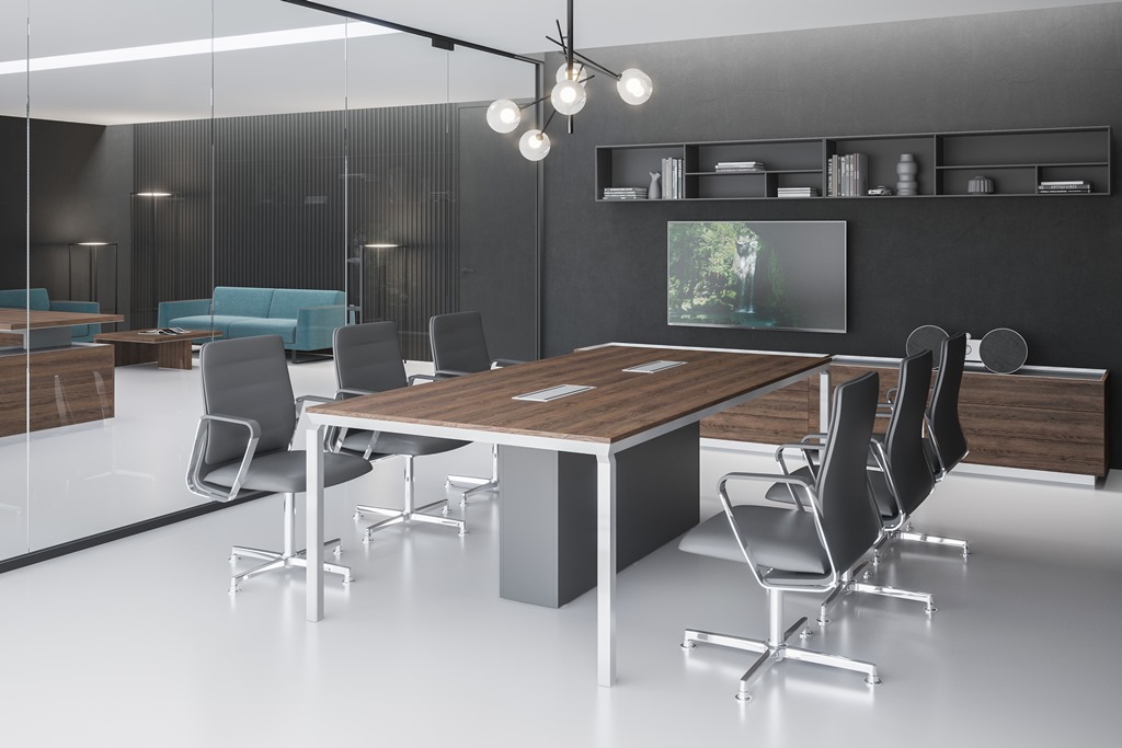 Hettich. Отделка натуральным алюминиевым профилем. Тумбы опорные и столы для переговоров