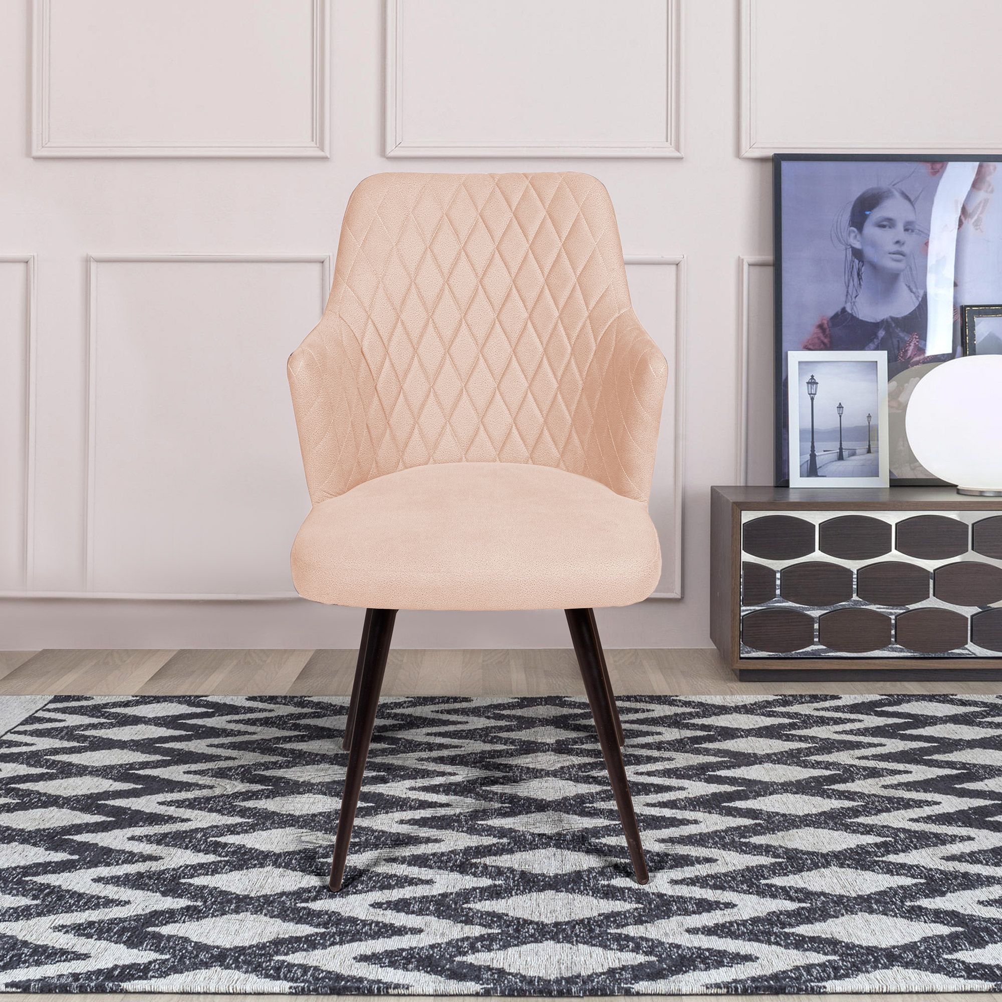 Дизайнерский стул «Hunt» c отделочной строчкой в виде ромба и острыми подлокотниками выглядит стильно и эффектно. Поворотный механизм на 90 градусов совершит мягкий бесшумный  поворот и самостоятельно вернется обратно в исходное положение,  благодаря функции «памяти».