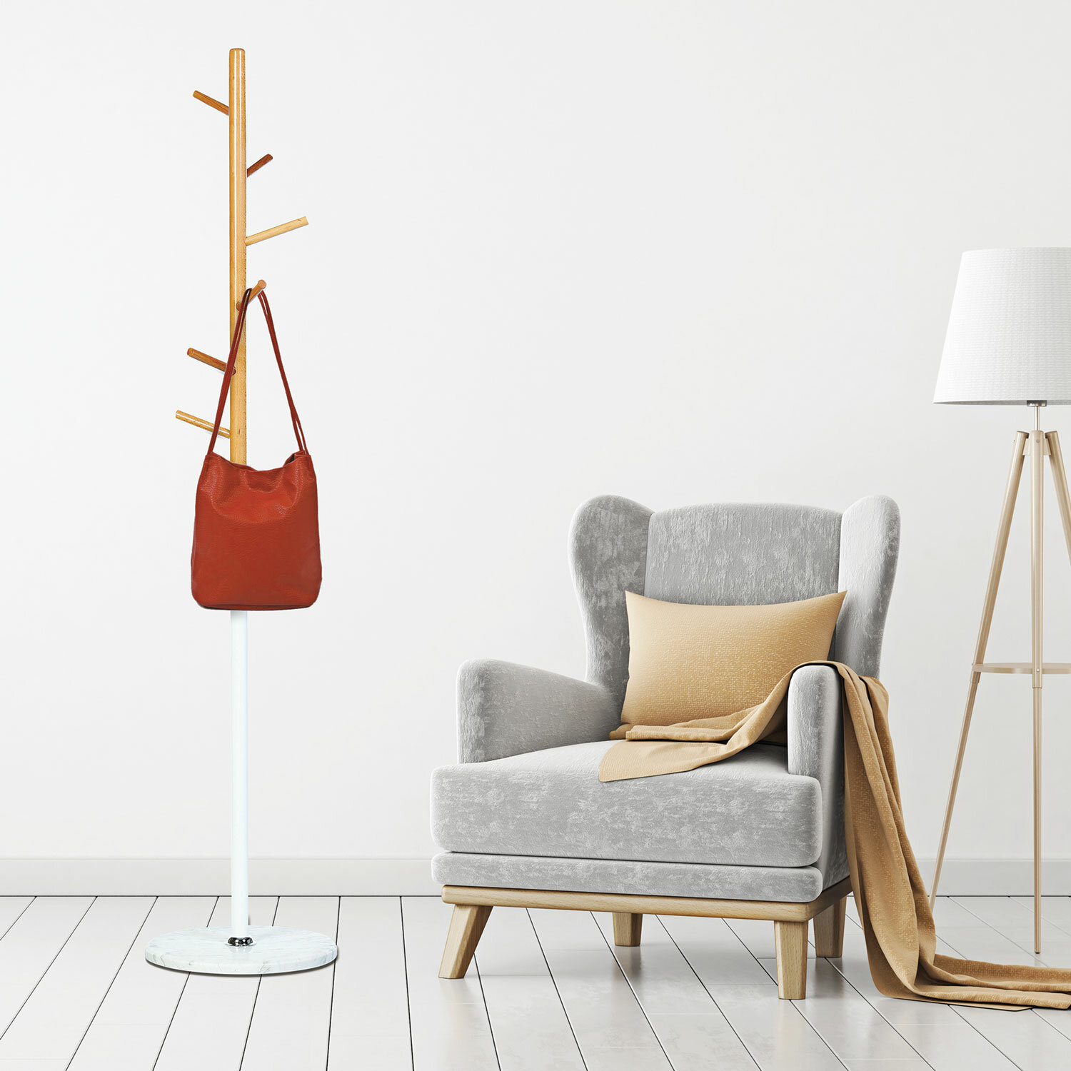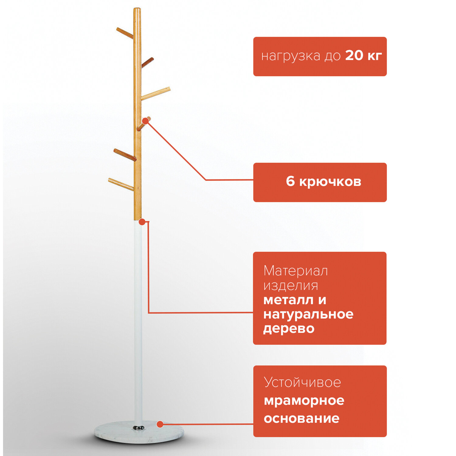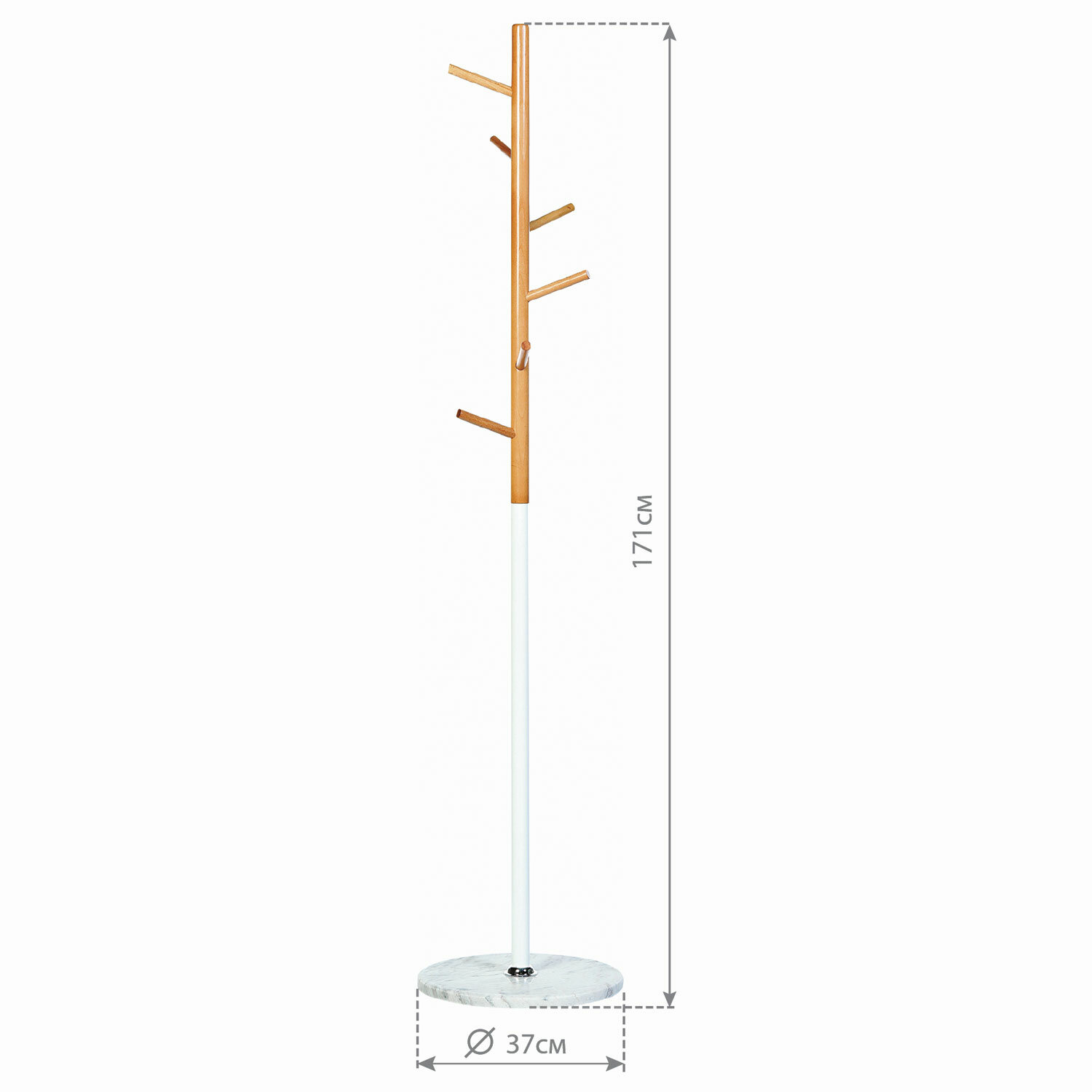 Верхняя часть вешалки-стойки выполнена из натурального бука, 6 крючков расположены "по спирали", что позволяет компактно разместить верхнюю одежду. Максимальная нагрузка на вешалку - 20 кг.Устойчивость данной модели обеспечивает основание из натурального мрамора.